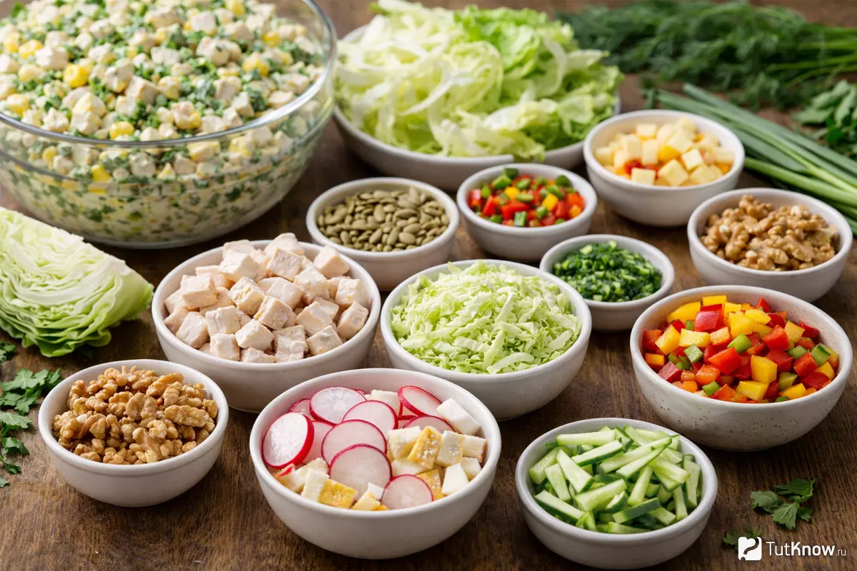 | Редис | Пикантность, плотный crunch | Тонко нарезать, смешать с основой |