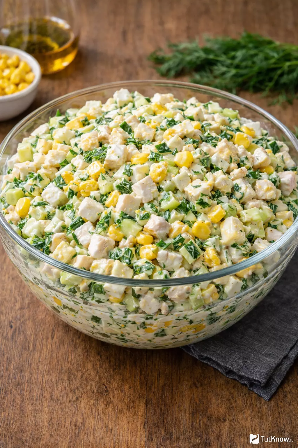 Этот салат с курицей и яйцом — удачное сочетание простоты, сытности и свежести. Он готовится из доступных ингредиентов, не требует сложной подготовки и всегда получается сбалансированным по вкусу. Нежная курица, яйца и кукуруза делают блюдо питательным, а свежий огурец, зелень и листья салата добавляют лёгкость и приятный хруст. Такой салат подойдёт и для повседневного меню, и для быстрого ужина, когда хочется чего-то простого, но вкусного.