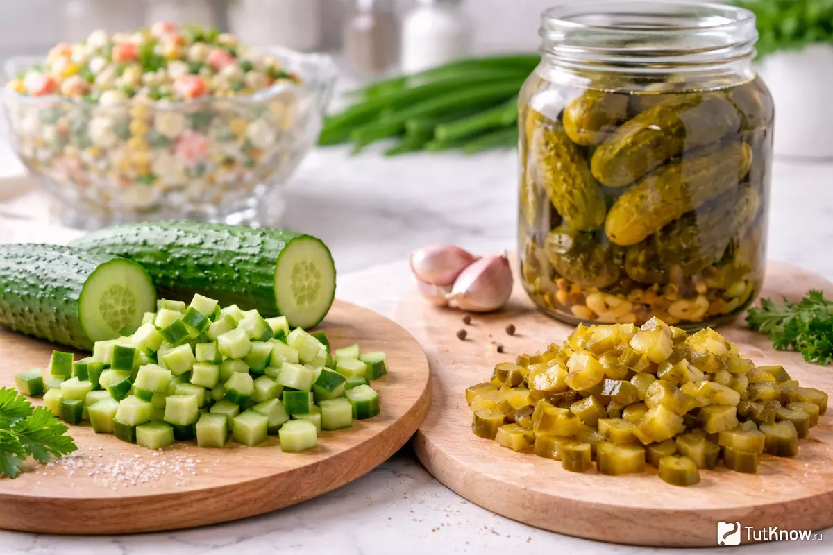 Если хочется лёгкости и свежести — выбирайте обычный огурец. Для более выразительного, пикантного вкуса подойдут маринованные. Иногда готовят салаты с сочетанием обоих видов: так появляется интересный баланс между свежестью и насыщенностью. Всё зависит от того, какой результат вы ждёте от блюда и ваших вкусовых предпочтений.