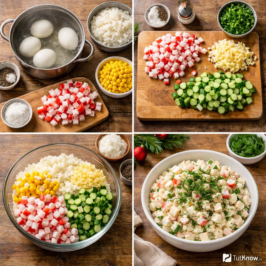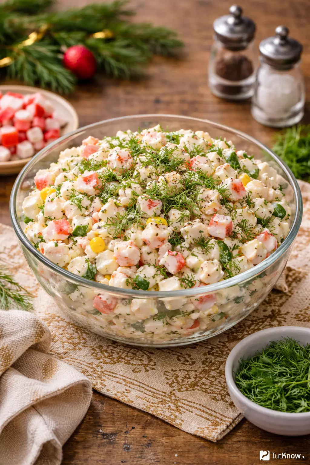 Салат с крабовыми палочками, яйцом, огурцом и рисом — это один из самых узнаваемых и любимых вариантов для новогоднего стола. Он получается лёгким, сочным и нежным, хорошо сочетается с праздничными закусками и нравится гостям любого возраста. Благодаря простым ингредиентам и аккуратной подаче салат легко адаптировать как для семейного ужина, так и для эффектной порционной сервировки.
