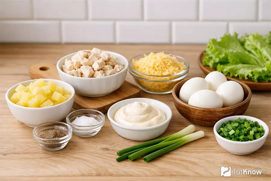 Для каждого продукта есть свои нюансы нарезки. С консервированным ананасом удобнее всего работать, если предварительно дать ему стечь в дуршлаге. Яйца очищайте полностью, чтобы скорлупа не попала в салат, а куриное филе нарезайте поперёк волокон для мягкости. Сыр лучше натирать на крупной тёрке, чтобы он не слипался, а зелень шинковать острым ножом, чтобы сохранить аромат.