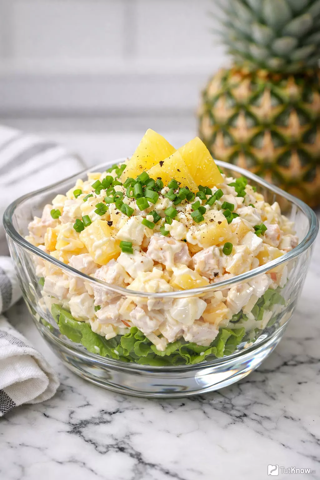 Вкус у этого салата получается нежный, с лёгкой сладостью ананаса и приятной пикантностью сыра. Хранить его лучше не дольше суток в холодильнике, чтобы сохранить свежесть и структуру ингредиентов. Блюдо отлично подойдёт для праздничного стола или в качестве лёгкого ужина. Я люблю подавать его порционно на листьях салата — так выглядит особенно аппетитно. Если останется немного, на следующий день можно использовать как начинку для сэндвича!