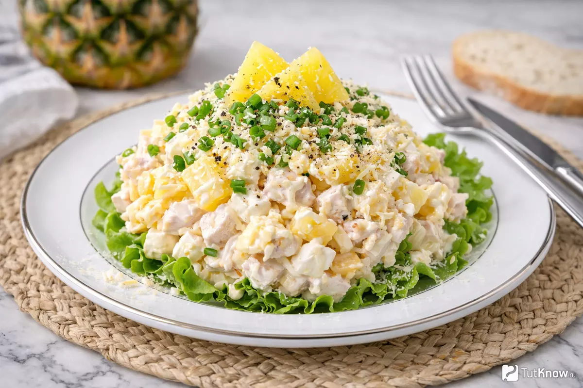Но если времени нет, и хочется попробовать сразу, — свежеприготовленный вариант тоже вполне уместен. В этом случае текстуры будут более выраженными: ананас останется чуть более хрустящим, а яйца — плотными. Такой салат отлично подойдёт в качестве быстрого перекуса или лёгкого ужина.