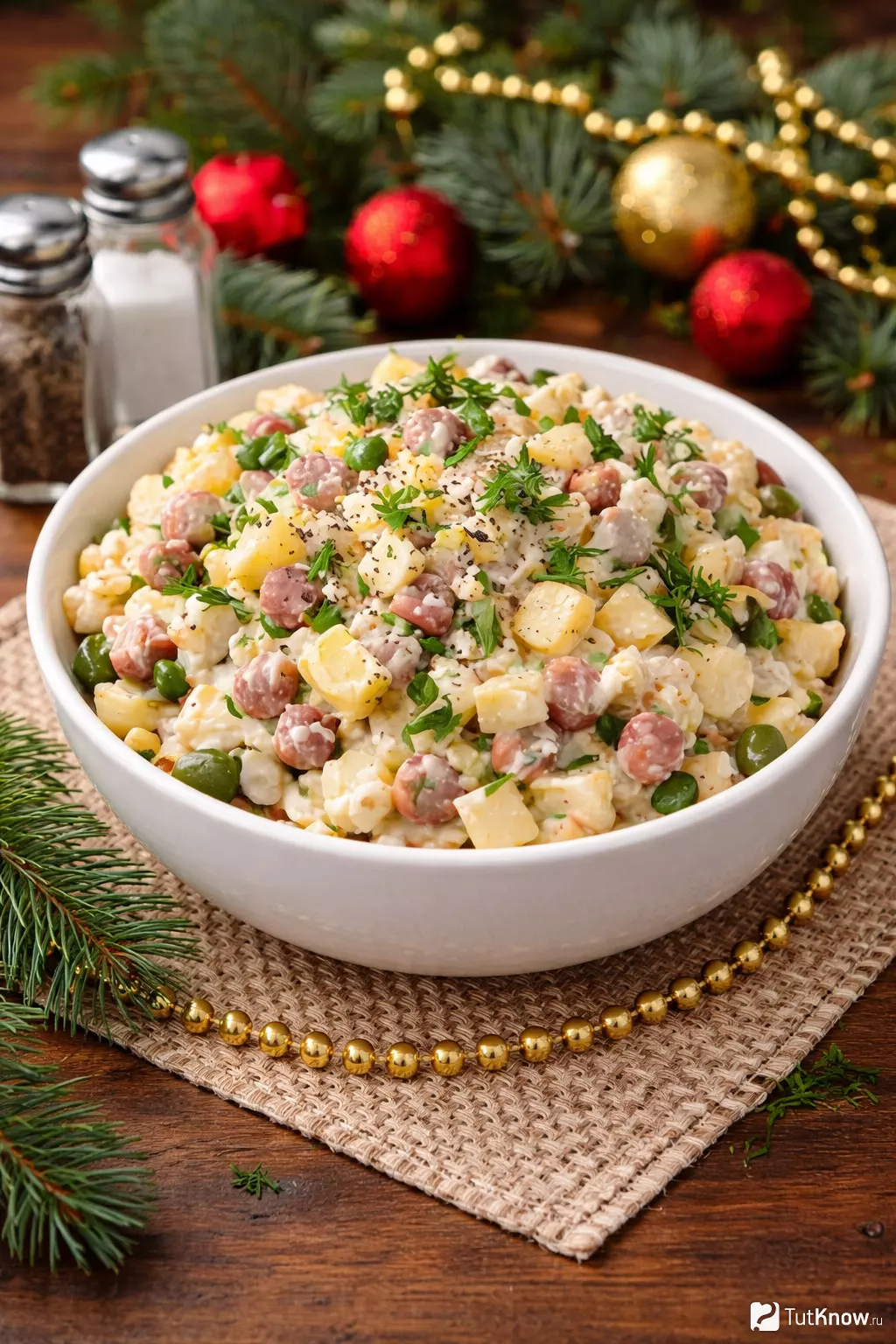 Оформление такого салата — отличный способ добавить новогоднему столу яркости и уюта. Можно использовать свежую зелень, фигурно нарезанные овощи или даже съедобные украшения, чтобы сделать блюдо более привлекательным.