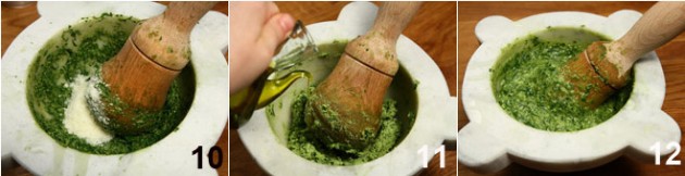 11. В «крем» песто понемногу подливая оливковое масло продолжать давить пестиком.