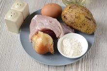 1. Перед тем, как приготовить рубленые котлеты с картофелем, подготавливаем ингредиенты. Очищаем от верхних оболочек луковицу, режем пополам, затем каждую половинку измельчаем в мелкий кубик. Моем и очищаем от кожуры одну картофелину средних размеров. Далее измельчаем с помощью металлической кухонной терки. Лучше это сделать как можно мельче, чтобы картофель успел приготовиться. Немного отжимаем, чтобы не было линей влаги. Мясо промываем, немного обсушиваем бумажной или тканевой салфеткой и нарезаем на небольшие кусочки. При этом совершенно необязательно четко соблюдать форму нарезки.