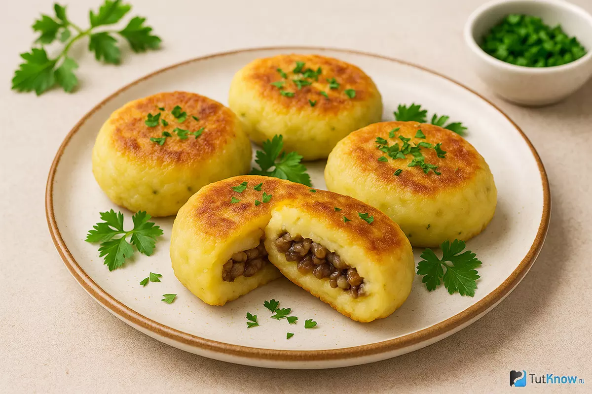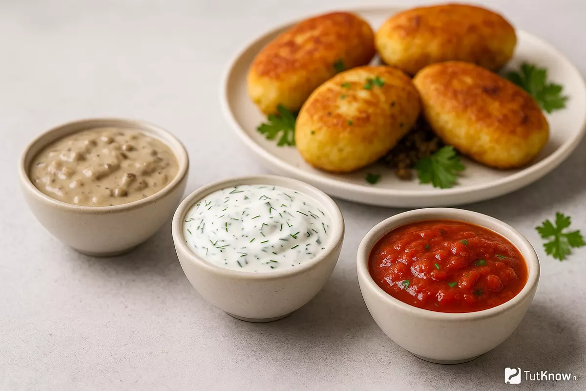 Грибной соус идеально дополняет картофельные зразы, усиливая вкус грибной начинки.