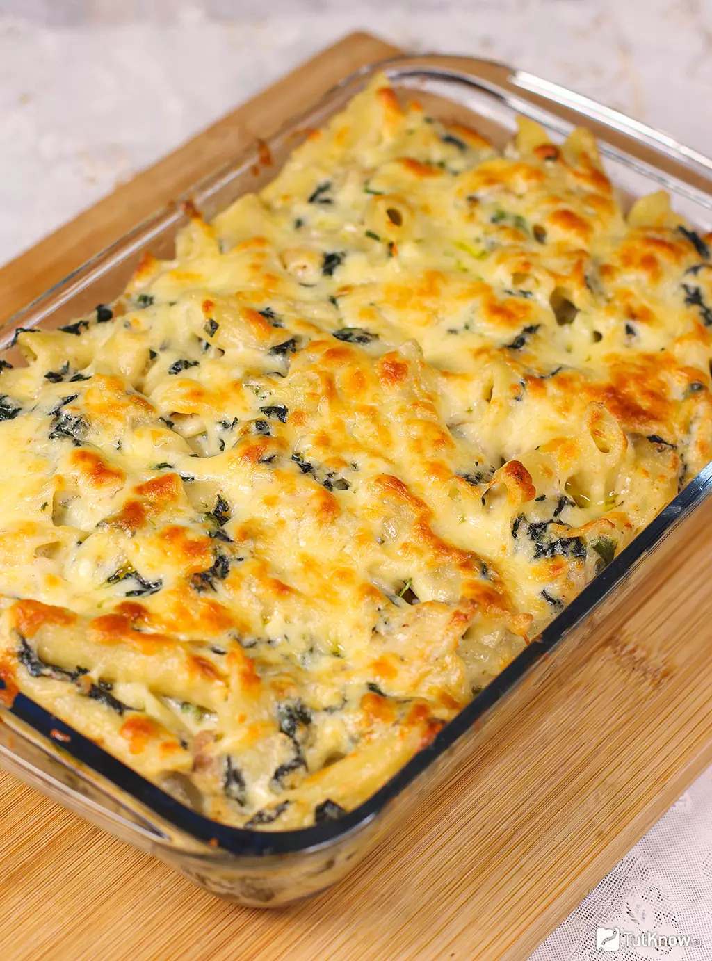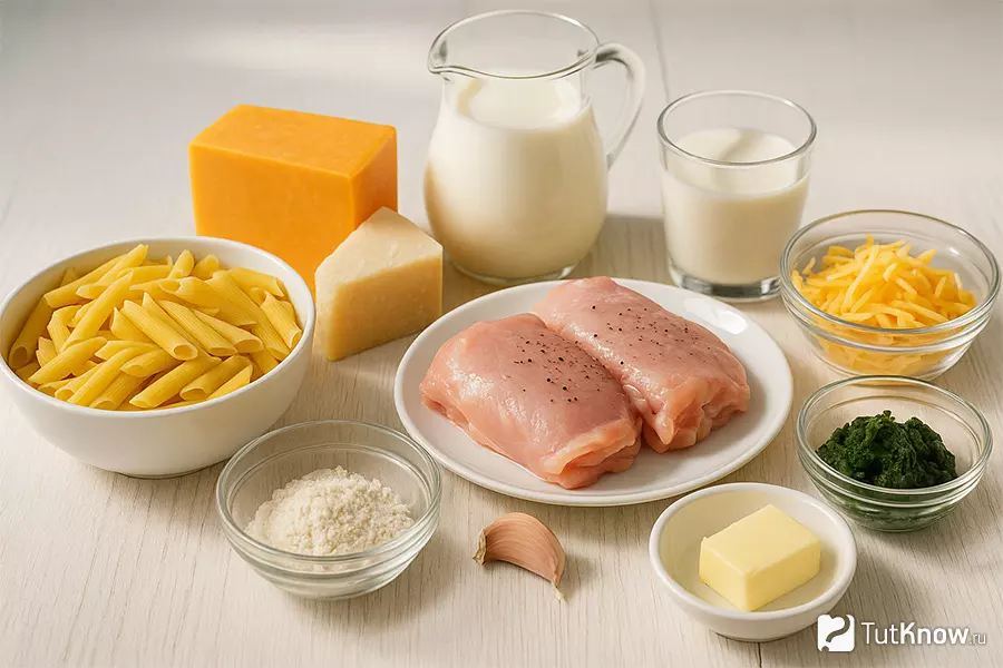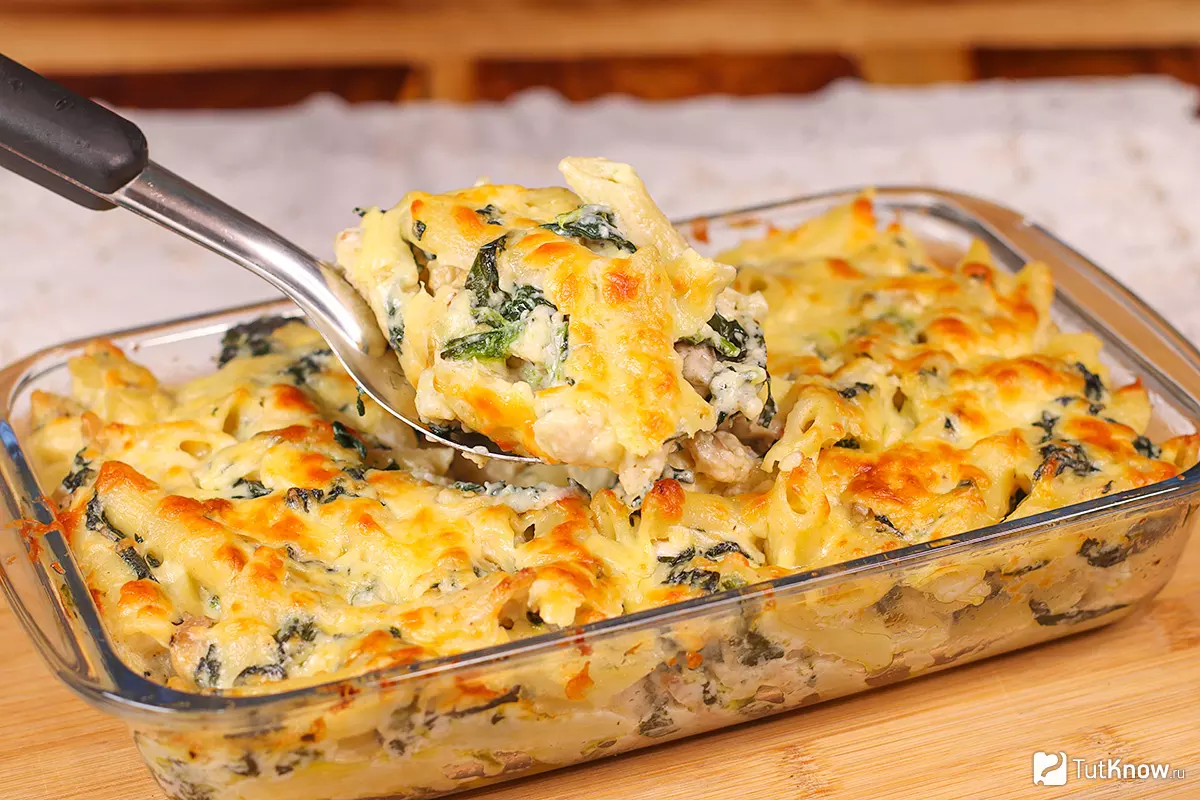 Готовый мак энд чиз с курицей и шпинатом получается нежным внутри и с аппетитной золотистой корочкой сверху. Соус густой и сливочный, паста хорошо удерживает вкус, а курица и шпинат делают блюдо более насыщенным и полноценным по составу. Сочетание чеддера и тёртого Грана Падано даёт выраженный сырный аромат и лёгкие ореховые нотки.