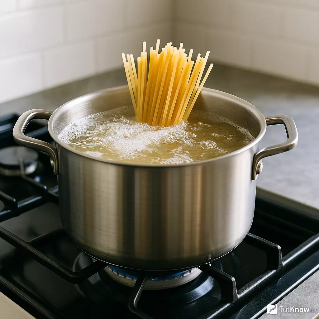 В большой кастрюле доведите до кипения воду, добавьте соль и опустите спагетти (400 г). Варите до состояния аль денте — около 8–10 минут. Периодически помешивайте, чтобы паста не слиплась.