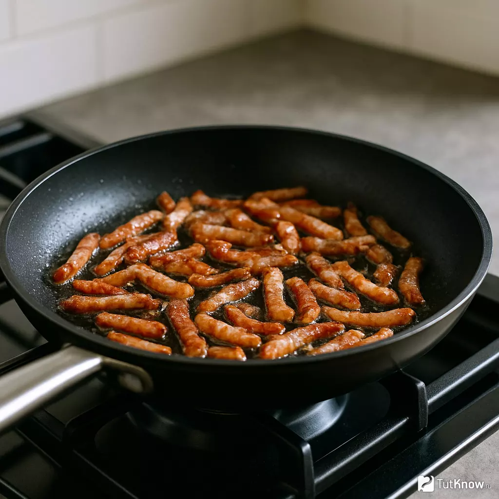 Пока варится паста, нарежьте гуанчале (150 г) тонкими мини-полосками, как на фото. Выложите его на сухую сковороду — масло добавлять не нужно. При нагреве из гуанчале сам выделится ароматный жир. Обжаривайте на среднем огне до хрустящей золотистой корочки, периодически помешивая, чтобы ломтики прожарились равномерно.