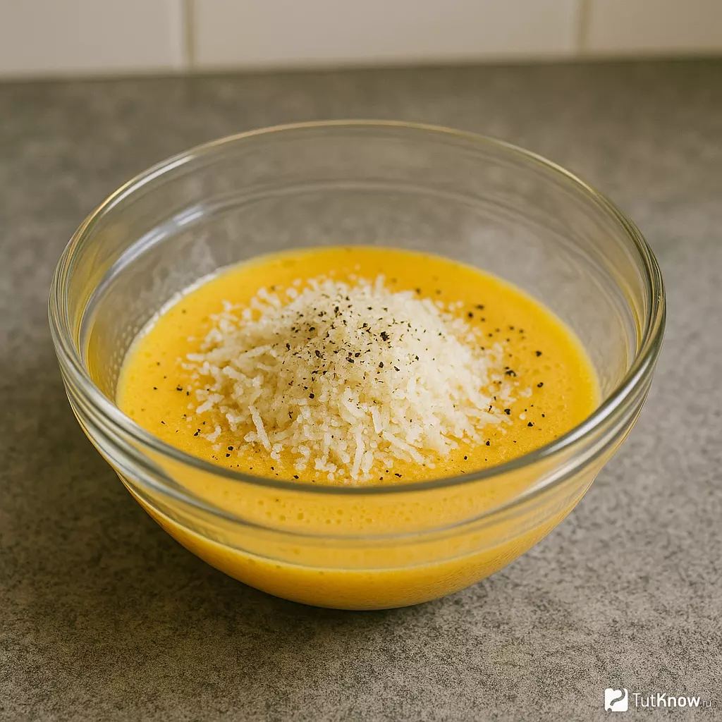 В миске взбейте желтки (5 шт.) и добавьте натёртый Пекорино Романо (100 г). Перемешайте до однородной консистенции. Всыпьте немного свежемолотого чёрного перца — он добавит аромата и лёгкой пикантности.