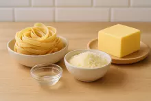 Пока паста варится, натрите пармезан (100 г) на мелкой тёрке — чем мельче, тем легче он растворится. В большой глубокой сковороде растопите сливочное масло (100 г) на минимальном огне. Масло не должно кипеть — просто расплавиться и стать ароматным.