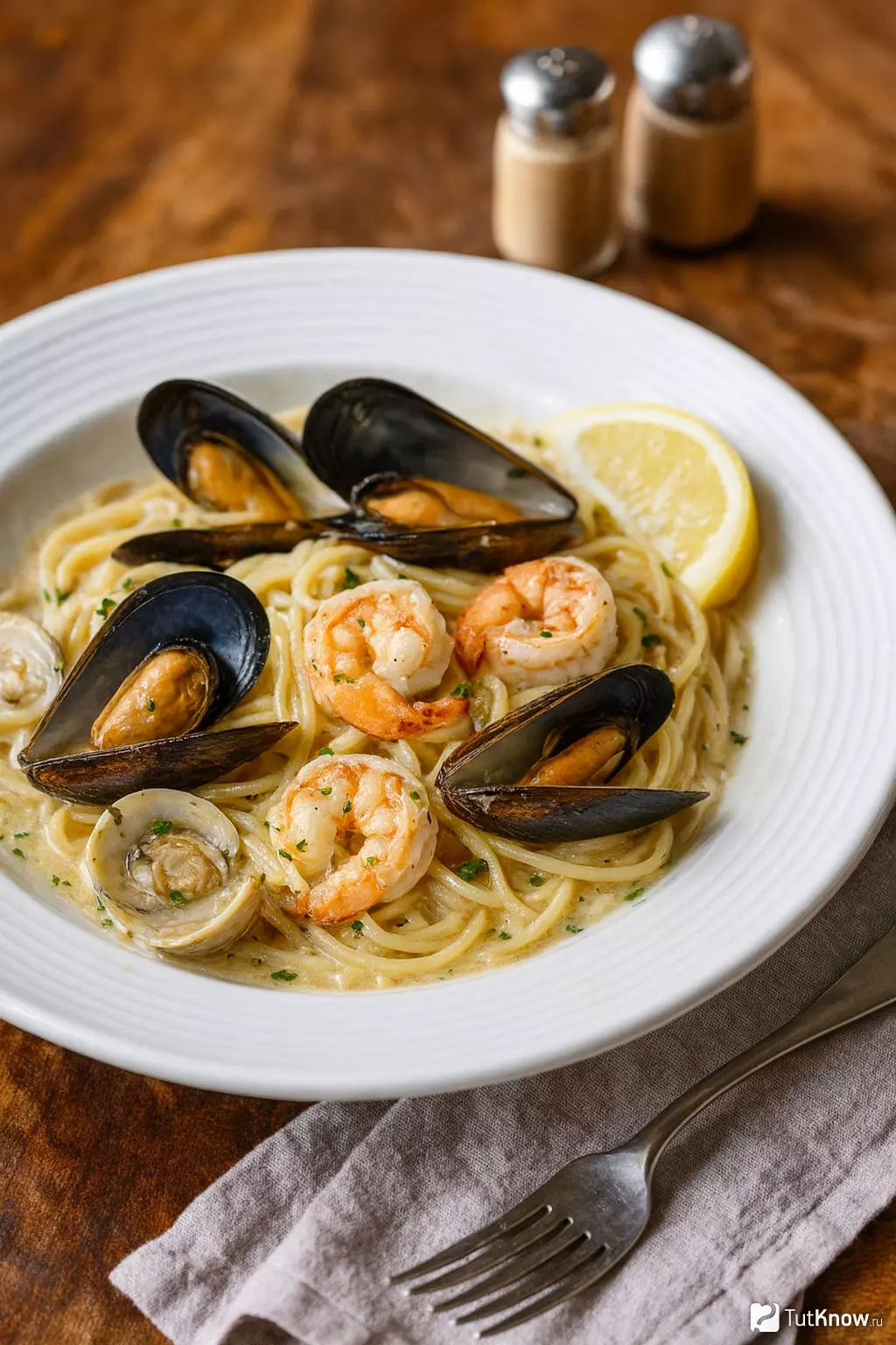 Паста с морепродуктами и белым вином — яркое блюдо итальянской кухни, где свежие морепродукты и сухое белое вино создают нежный соус. Это блюдо идеально подходит для ужина или обеда, особенно летом. Исторически такое сочетание возникло в прибрежных регионах Италии, где морепродукты всегда были в изобилии. Оно позволяет насладиться богатым вкусом и получить порцию белка и микроэлементов.