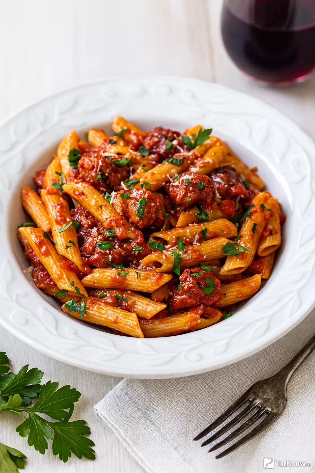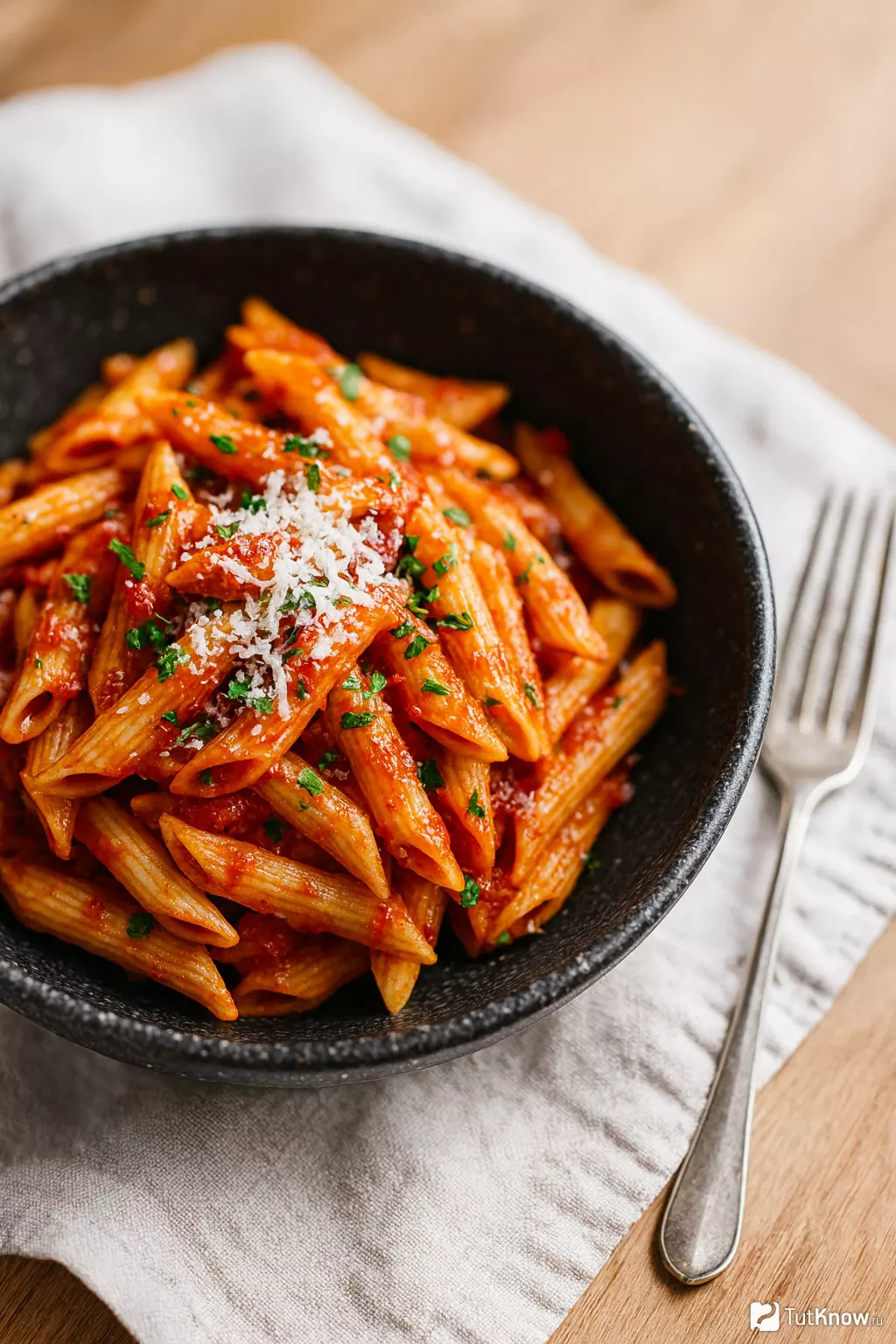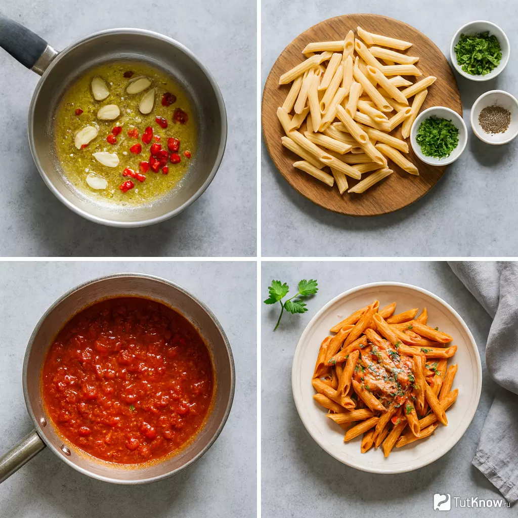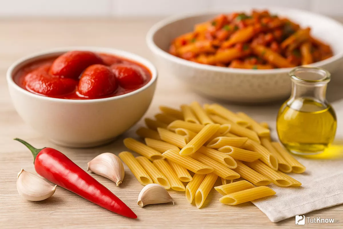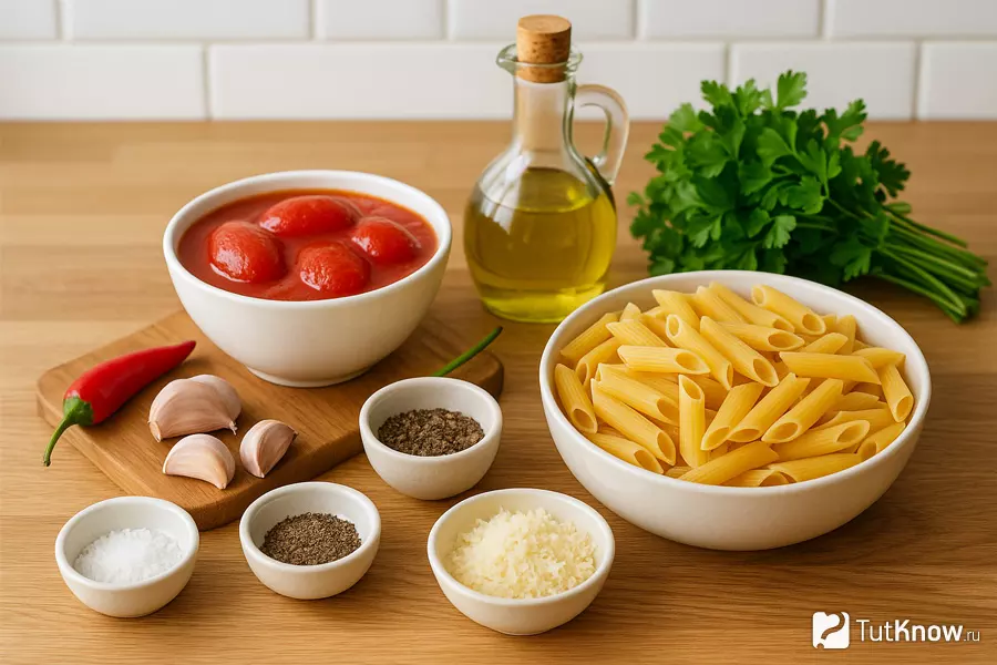 В состав классического блюда входят пенне, соус из помидоров, чеснок и красный перец чили. Часто добавляют свежую зелень, такую как петрушка или базилик, чтобы подчеркнуть аромат. Пармезан, натертый сверху, завершает блюдо, придавая ему легкую сырную нотку.