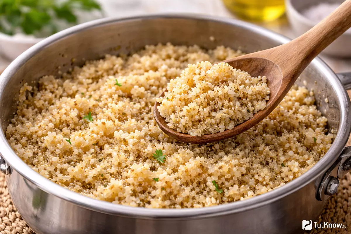 - Если киноа кажется суховатой: добавьте 1–2 ст. л. горячей воды или бульона, перемешайте и дайте постоять под крышкой пару минут.