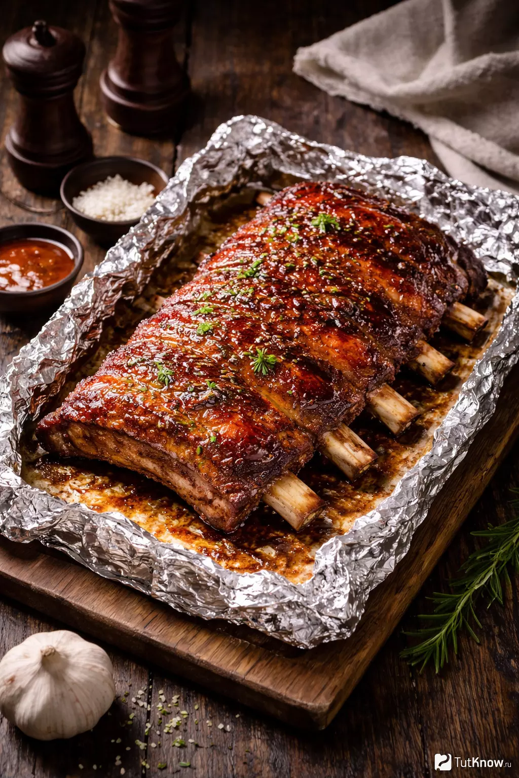 Секрет мягких ребрышек — правильный маринад и запекание в фольге. Маринад смягчает волокна и усиливает вкус, а фольга удерживает влагу, поэтому мясо томится в собственном соке и не пересушивается.