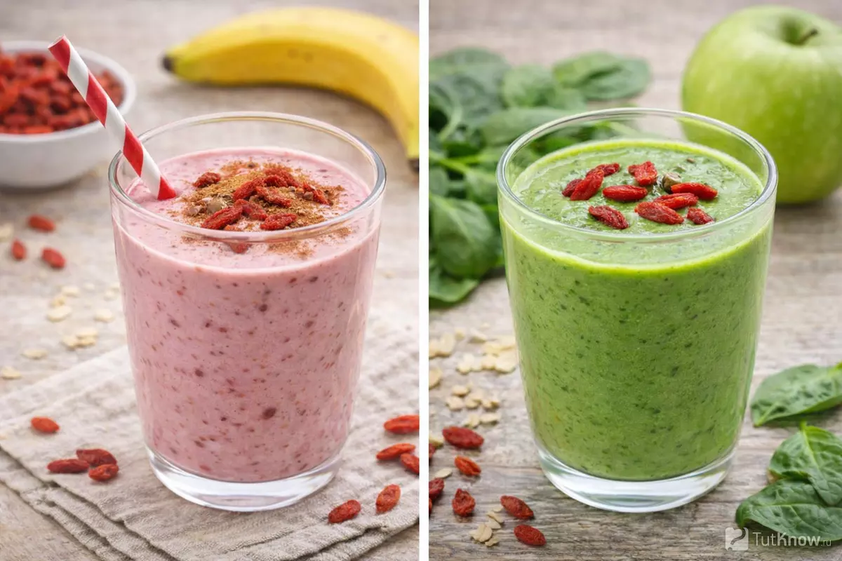 - Взбить в блендере йогурт (200 мл), банан (1 шт.), ягоды годжи и немного настоя (50–80 мл).