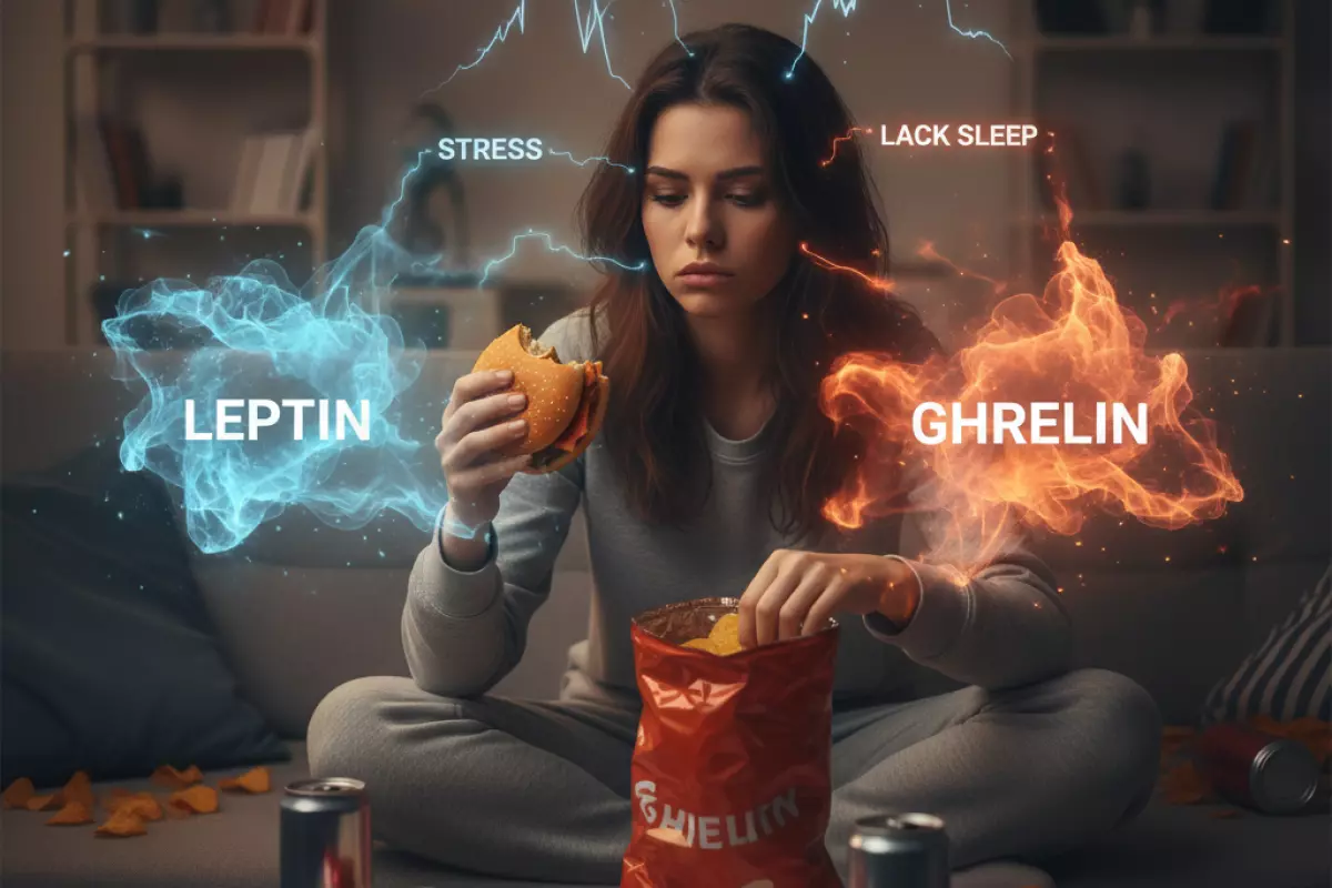 Два главных регулятора здесь — лептин (условный «тормоз» аппетита) и грелин (условный «газ»). При хронической усталости лептиновый сигнал часто ослабевает, а грелин, наоборот, может повышаться. Это сочетание делает порции больше, перекусы — чаще, а чувство насыщения — менее устойчивым.