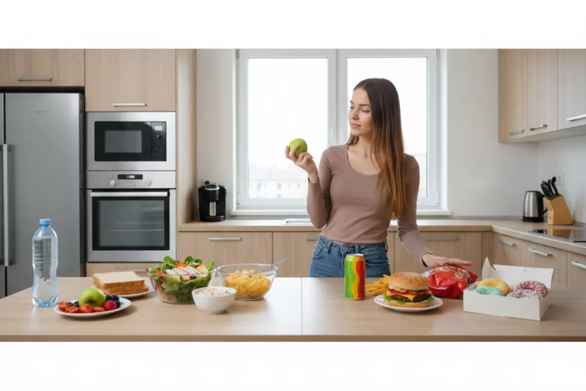 - Умеренный дефицит энергии без резкого падения калорийности. В быту это чаще выглядит как минус сладкие напитки, меньше перекусов «на автомате», чуть скромнее порции.