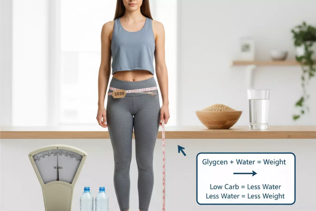 Гликоген — это форма хранения углеводов. Когда вы едите меньше (особенно если урезали сладкое, выпечку, крупы), организм начинает тратить эти запасы. Особенность в том, что на каждый грамм гликогена обычно приходится несколько граммов связанной жидкости. Поэтому при расходовании запасов уходит и «прицепом» часть жидкости — вес уменьшается быстро, а талия и бёдра могут почти не сдвинуться.