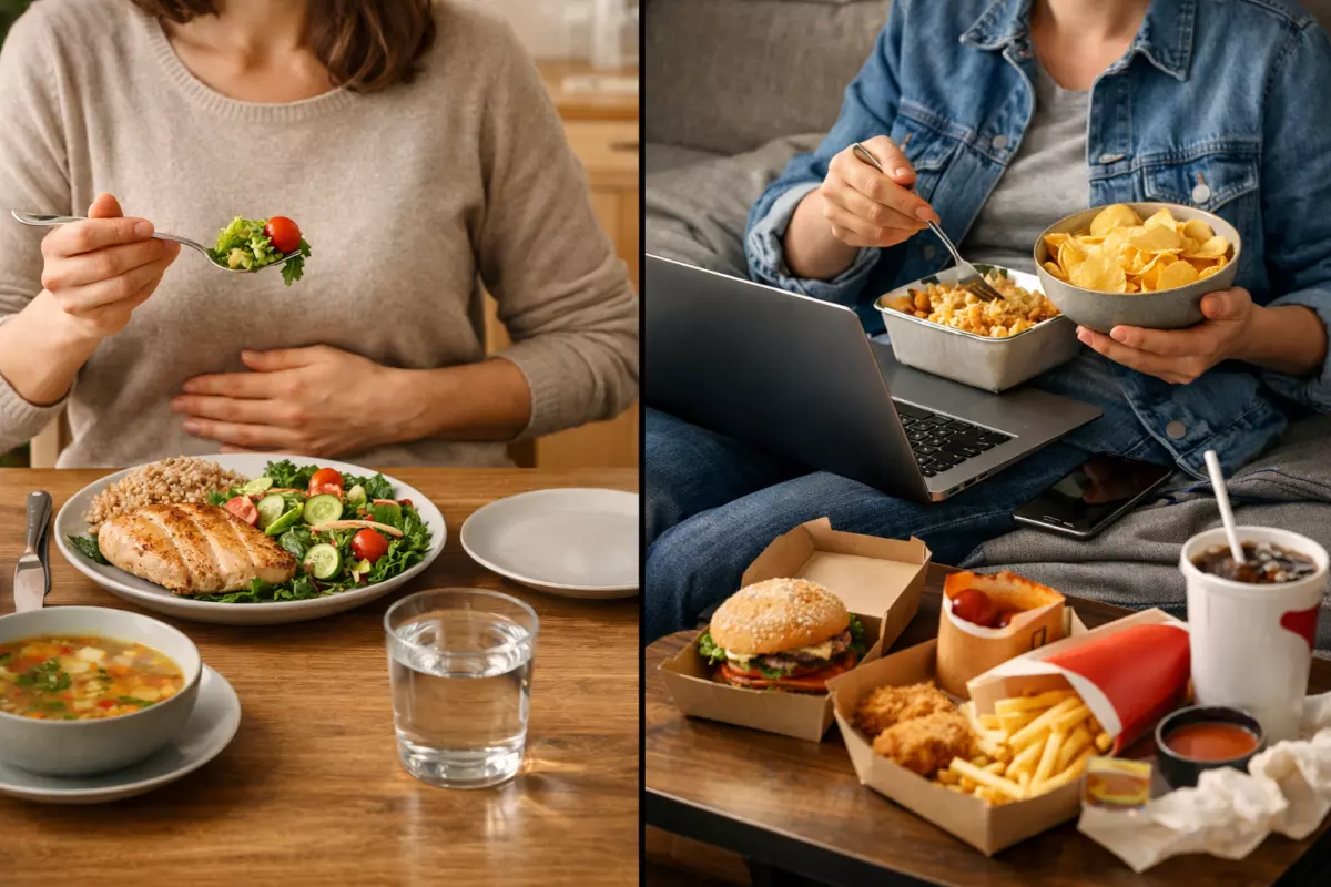 Один из самых частых сценариев — пропустить прием пищи, дотерпеть до вечера, а потом есть быстро и без остановки. Другой вариант — целый день держаться на «правильной» еде без удовольствия, а ночью искать компенсацию в сладком и снеках. В обоих случаях проблема не в слабом характере, а в плохо устроенном режиме.