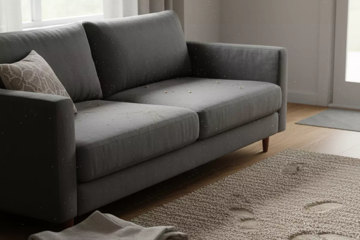 - Диваны, кресла, матрасы — крошки, волокна одежды и шерсть забиваются в швы и под подушки.