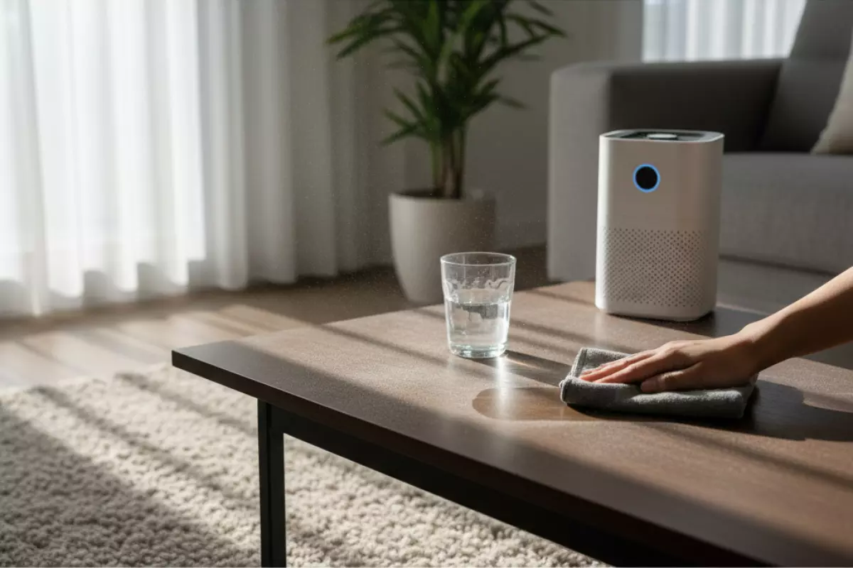 Сухой воздух делает мелкие частицы более «летучими»: они дольше держатся в помещении и быстрее оседают на мебели. При этом проветривание важно, но его лучше делать управляемо.