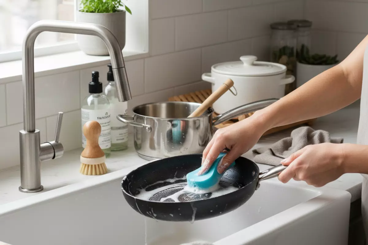 | Антипригарное (PTFE) | Тёплое замачивание, мягкая губка, средство для посуды | Металл, абразивы, жёсткие щётки, длительное кипячение с содой | Работайте короткими циклами: замочили — протёрли — повторили |