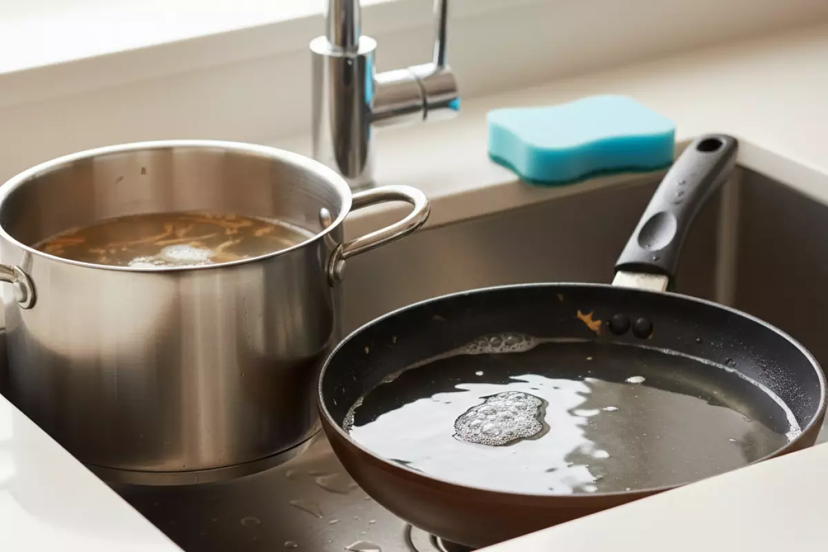 Действуйте сразу, пока слой не успел «схватиться»: так вы обойдётесь без жёстких абразивов и не рискуете поцарапать антипригарный слой, эмаль или нержавейку. Важно: не лейте холодную воду на раскалённую посуду — от перепада температур покрытие и дно могут повести.