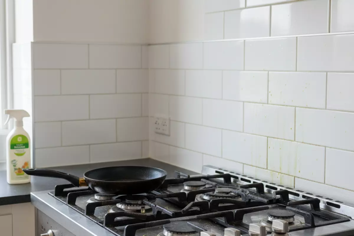 Плитка и стекло отмываются сравнительно легко, а вот затирка и стыки — слабое место. В микропорах задерживаются частицы масла, и поверхность темнеет «полосами».
