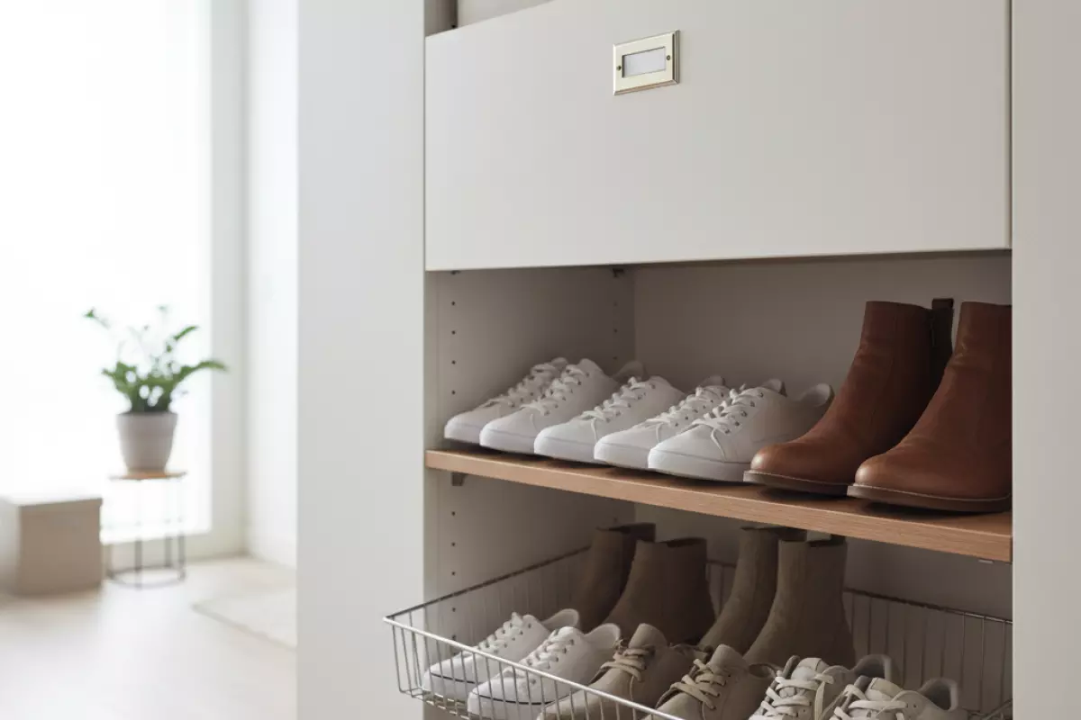| Сезонные пары хранятся вперемешку | При каждом выходе нужно двигать лишнее, и вещи постепенно остаются «где попало» | Нужная пара внизу, сверху — стопка «не по погоде» |