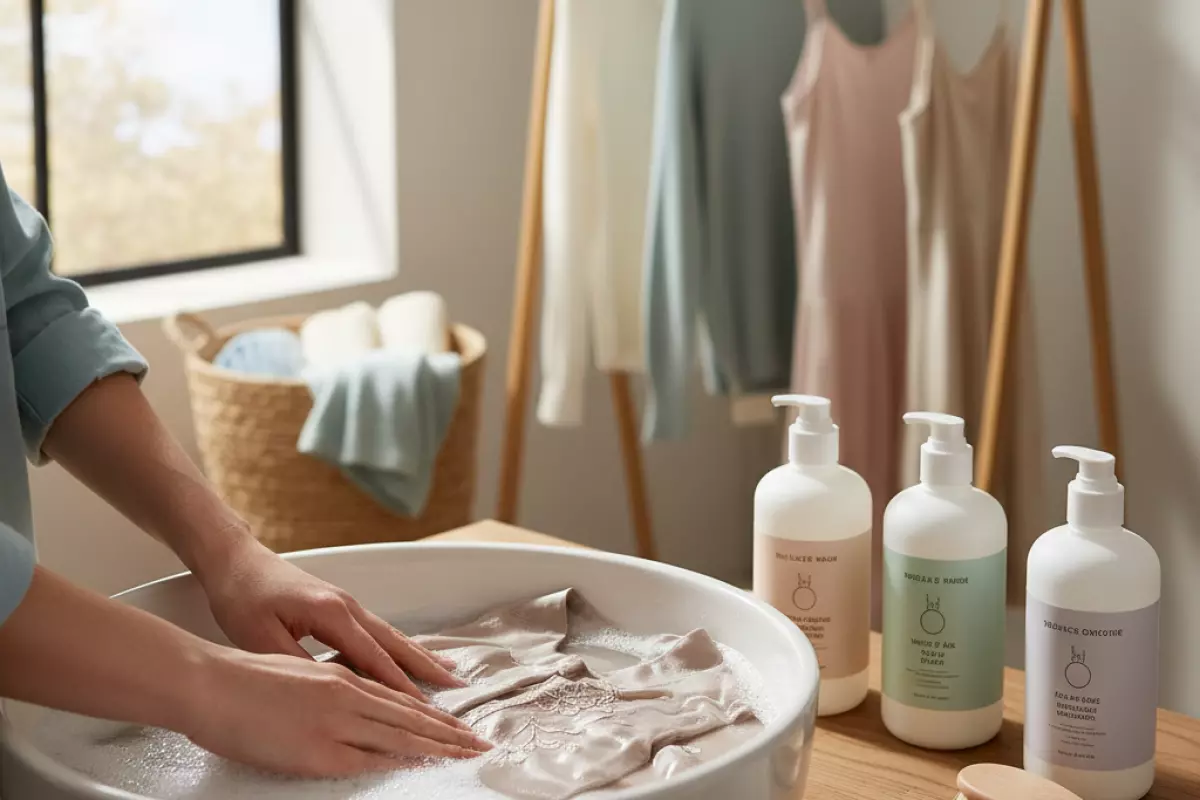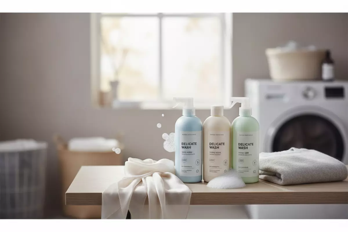 Для домашнего ухода за капризными материалами лучше выбирать мягкие составы без агрессивных отбеливателей и сильных ароматизаторов. Идея простая: чем меньше «химической нагрузки» и чем нейтральнее pH, тем ниже риск, что полотно станет жестким, потеряет блеск или пойдёт затяжками.