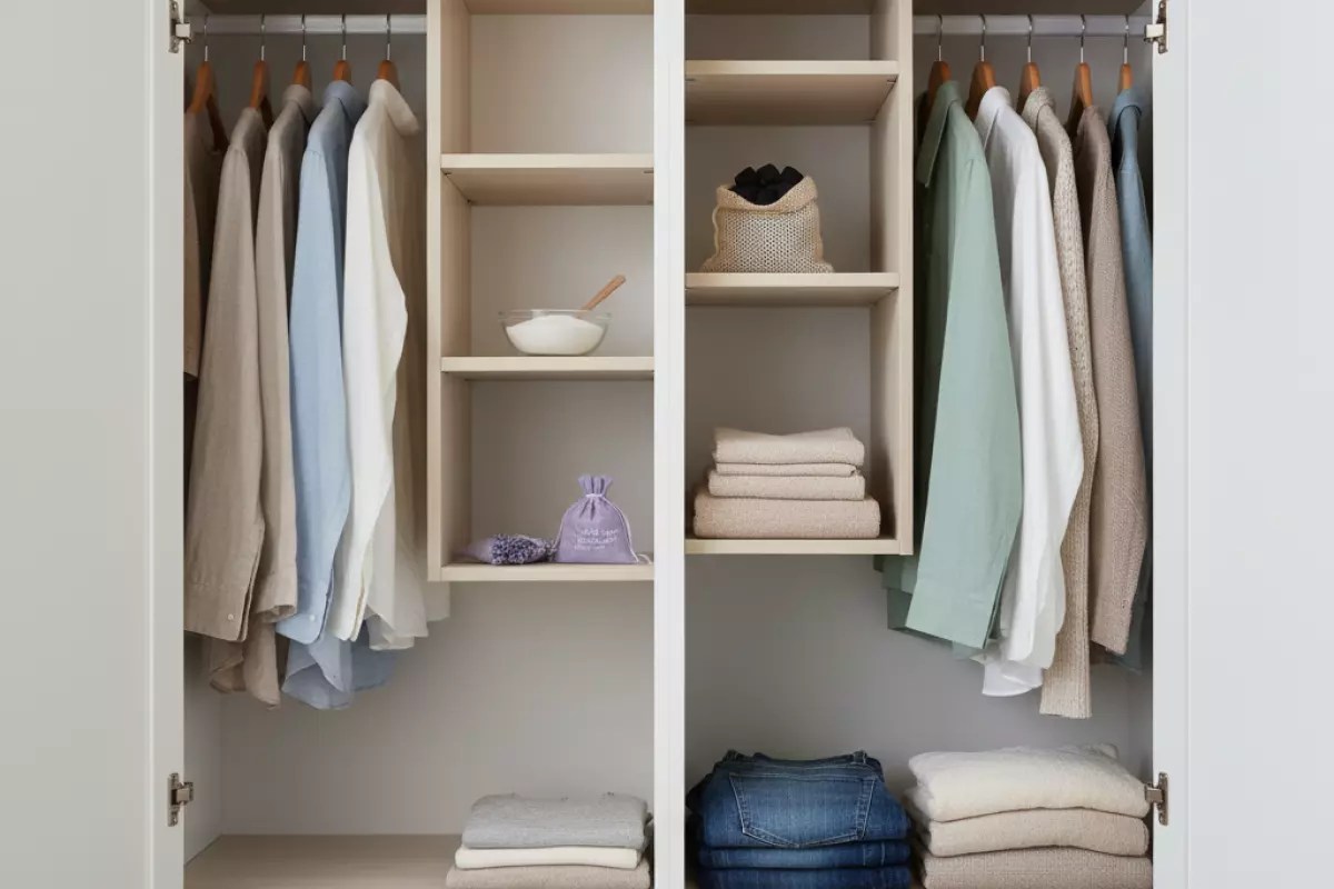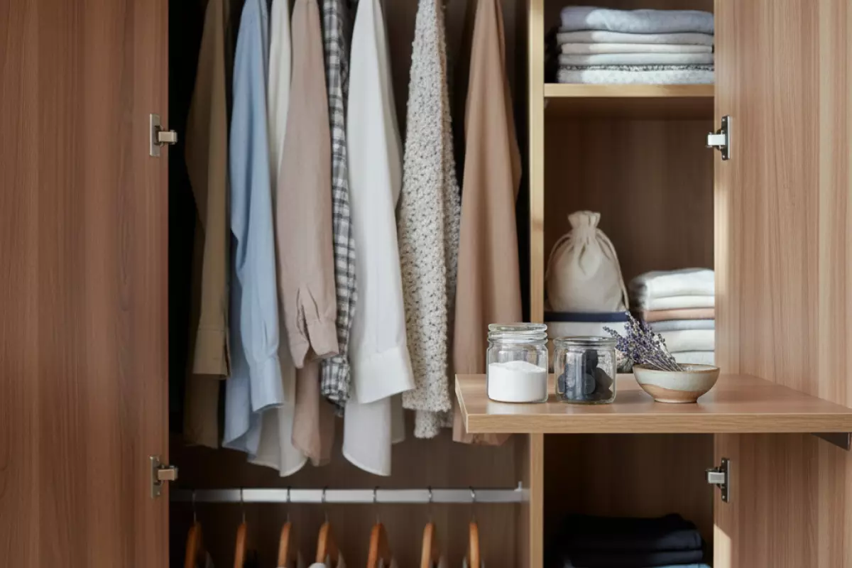 Сначала убери источник: проветри шкаф, протри полки и дай им полностью высохнуть. После этого простые домашние абсорбенты и ароматизаторы работают заметно лучше — они не «маскируют», а постепенно вытягивают лишние запахи из воздуха и тканей.