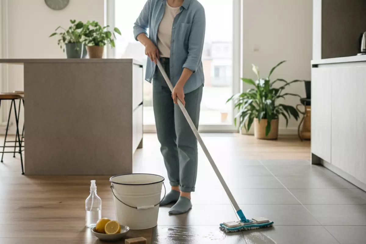 Выбор зависит от материала. Плитка переносит более активную влажную уборку, а дерево и ламинат любят минимум воды. Натуральные средства здесь хороши тем, что не оставляют тяжёлого запаха и липкой плёнки, из-за которой пол быстро пачкается снова.