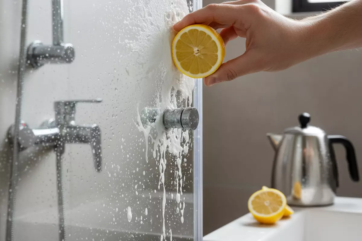 Лимон удобен там, где нужно мягко растворить белёсые следы от жёсткой воды и освежить поверхность без резкого запаха. Работает он за счёт лимонной кислоты, поэтому особенно полезен для кранов, душевых леек, стеклянных перегородок и чайников. Для очень толстого слоя извести его силы может не хватить, но со свежим налётом он справляется хорошо.