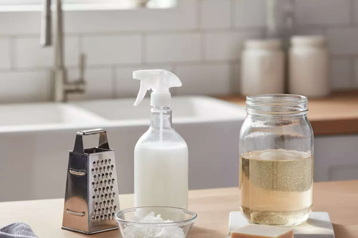 Для повседневной уборки удобнее иметь один базовый состав, который подходит для большинства моющихся поверхностей: столешниц, фасадов, подоконников, плитки, дверей. Самый практичный вариант — мягкий мыльный раствор с небольшим усилением, а не агрессивная смесь «на все случаи». Так меньше риск испортить покрытие и проще контролировать результат.