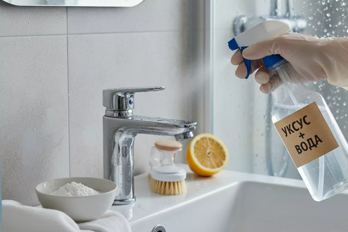 Уксус чаще всего действует быстрее лимона, особенно на стеклянных перегородках и плитке. Его удобно наносить на салфетку или распылять на тряпку, а не прямо на поверхность, чтобы не вдыхать лишние пары. После 10–15 минут налёт обычно размягчается и легче снимается.