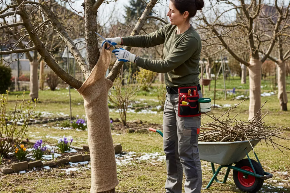 - Поставьте ловчие пояса на плодовые, когда начнутся стабильные оттепели: это помогает против ползущих насекомых.
