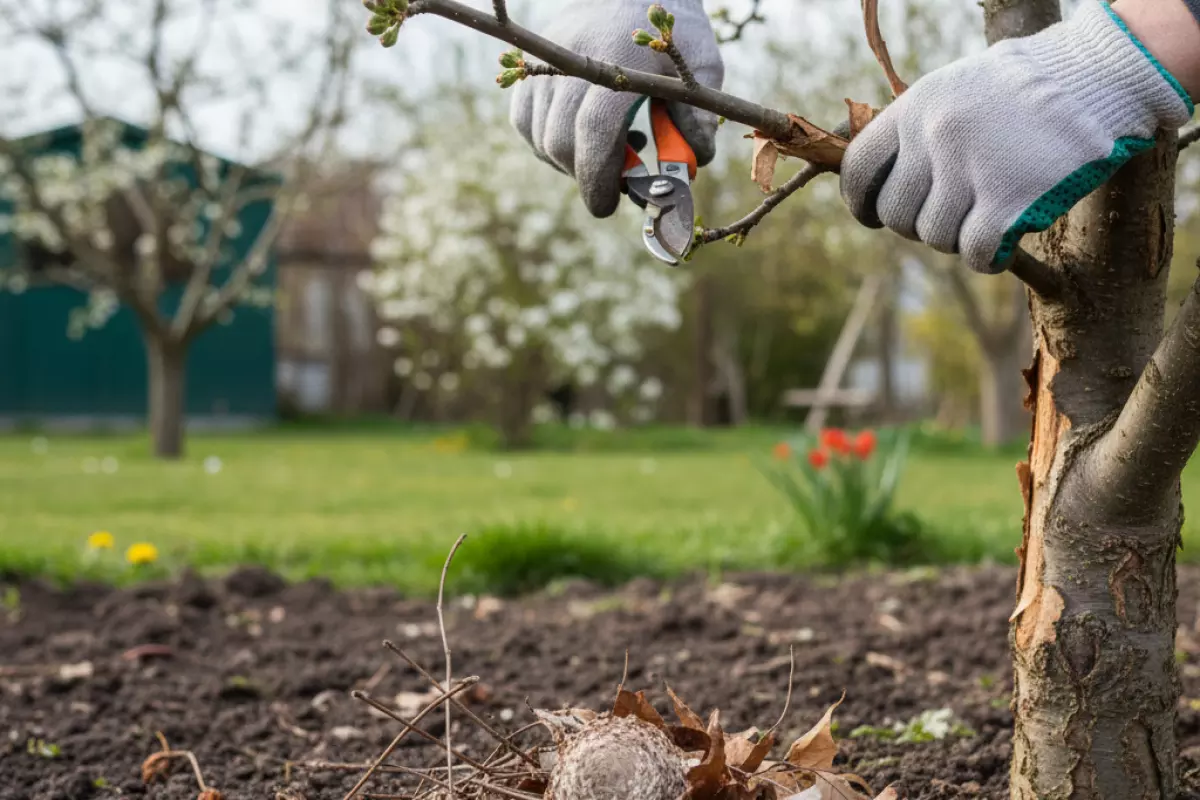 Сразу после схода снега проверьте посадки: подопревшую кору, морозобоины, поломанные ветви, следы грызунов. Раны зачистите до живой ткани, обработайте и закройте садовым варом или пастой. Приствольные круги аккуратно освободите от старой мульчи и мусора, чтобы почва быстрее прогрелась и не прела.