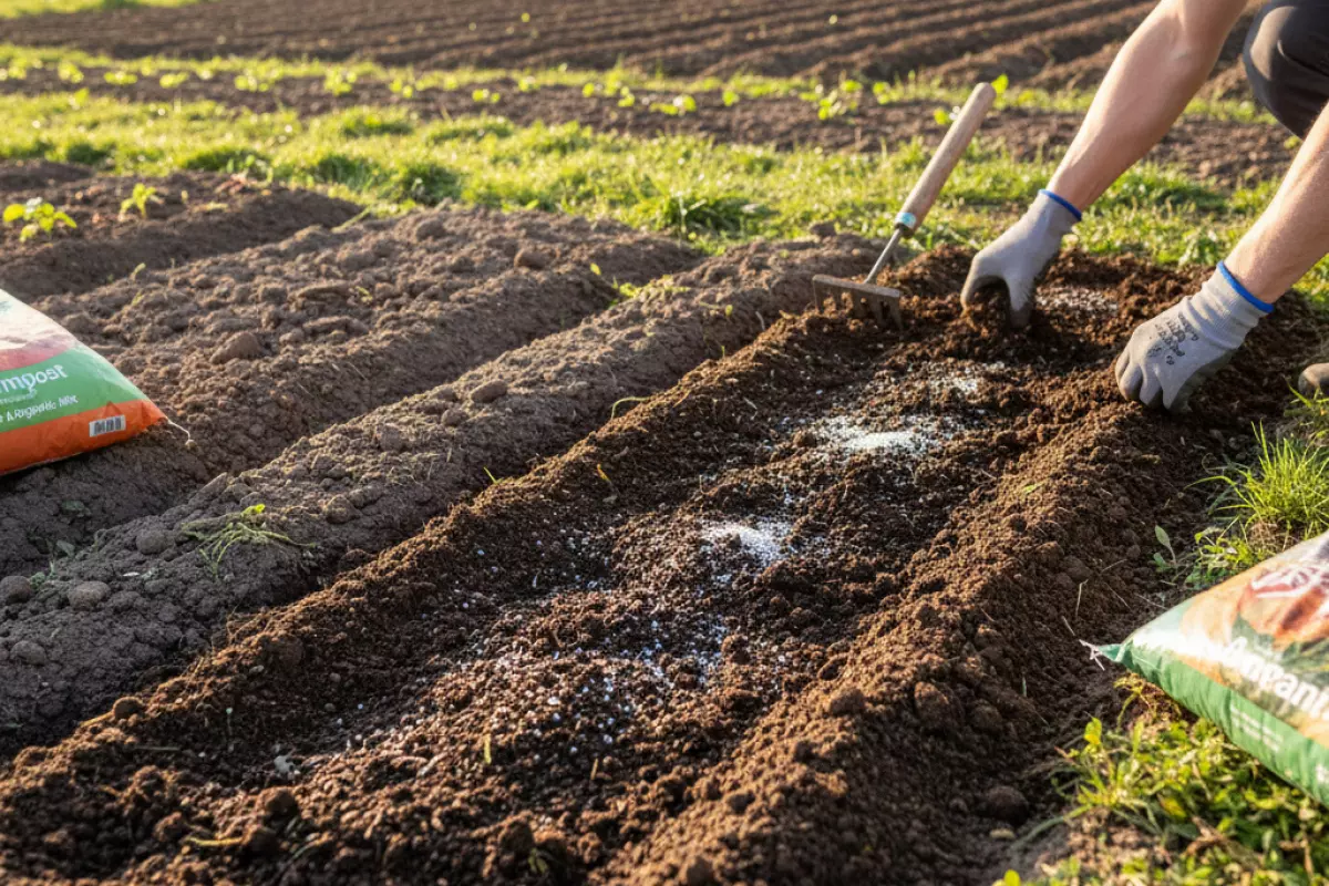 Органику и разрыхляющие добавки удобнее распределять до финального выравнивания, чтобы они оказались в верхнем слое. Компост и перегной обычно заделывают неглубоко, а свежий навоз весной лучше не использовать на грядках под ранние культуры — он «жжёт» корни и провоцирует лишнюю ботву. Если планируете раскисление, материал равномерно рассыпают и аккуратно смешивают с поверхностью, без глубокого заглубления.