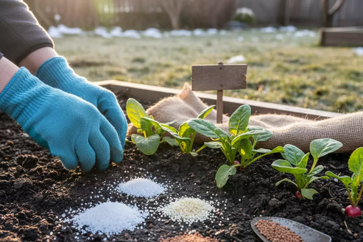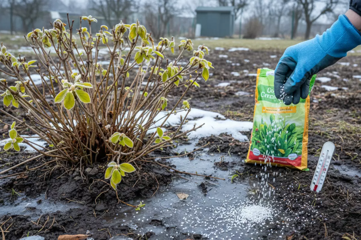 | Клубника | Небольшой азот / зола | Зола 100–150 г/м² или азот — по инструкции | После схода снега, по влажной земле | Не сыпьте по цветам; после внесения — полив или заделка |