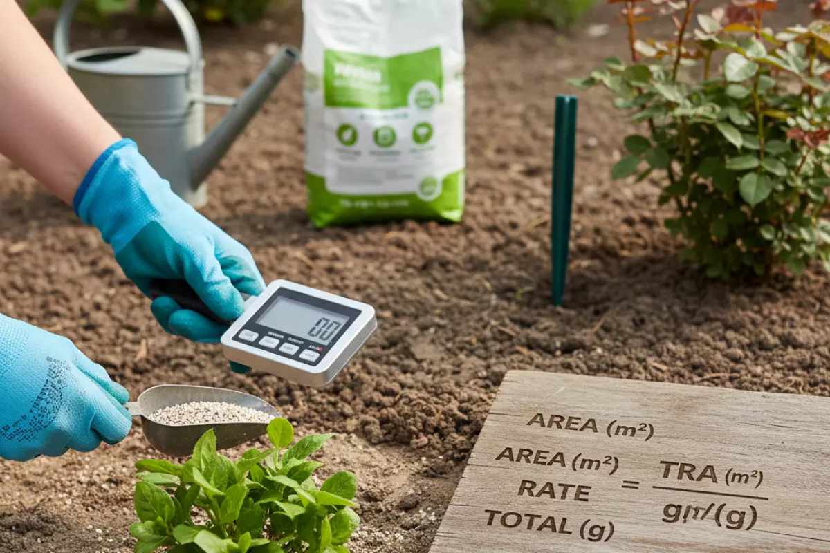 - Переведите норму в нужный объём: «на всю площадь» или «на один куст».
