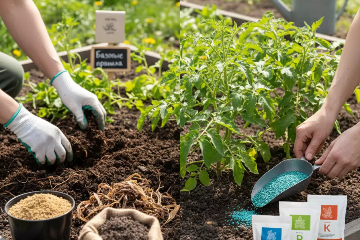 | Сидераты (заделанные) | Стартовая доза фосфора и калия | Сидерат — заделать заранее, минералы — при формировании грядки | Участки после истощающих культур | После свежей заделки зелёной массы азот лучше не форсировать |