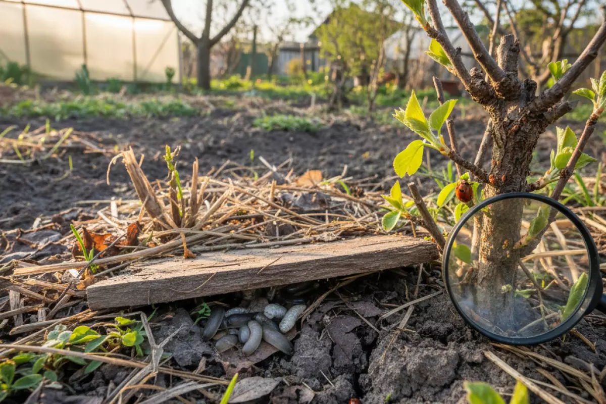 - Срывает старт размножения вредителей — яйца и личинки часто зимуют в трещинах коры, под растительными остатками, в верхнем слое земли.