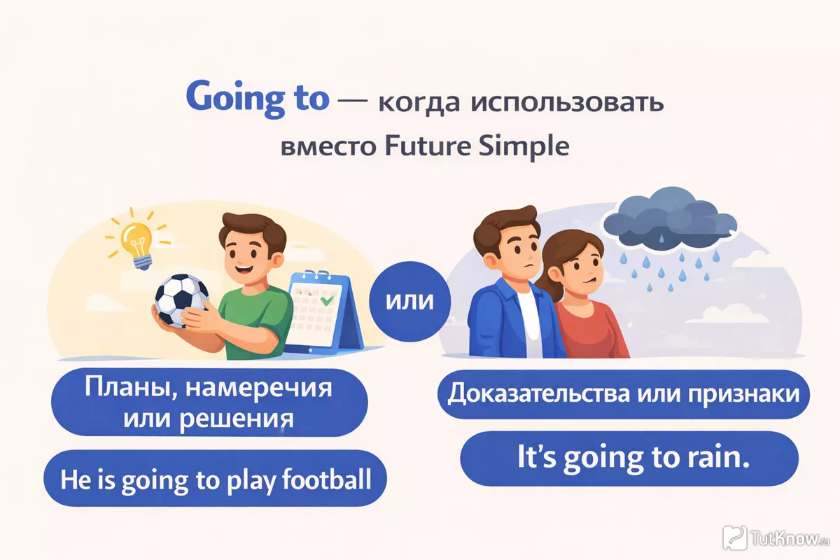 В отличие от Future Simple, который подходит для спонтанных решений, «going to» показывает, что вы уже что-то задумали или подготовились к действию. Особенно часто его используют, когда есть признаки, что событие скоро произойдёт, или если это часть личных планов.