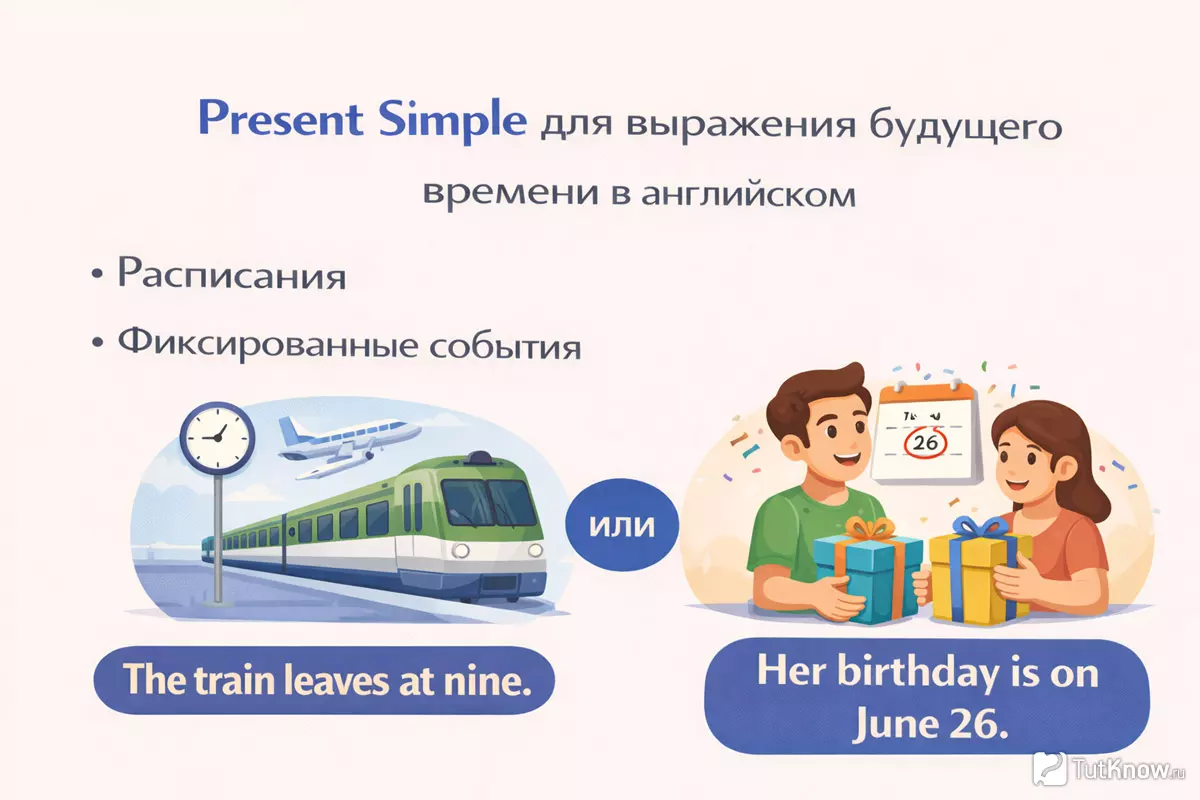 | Present Simple | Официальные расписания, регулярные события, графики | The train leaves at 7 am. The shop opens tomorrow. |