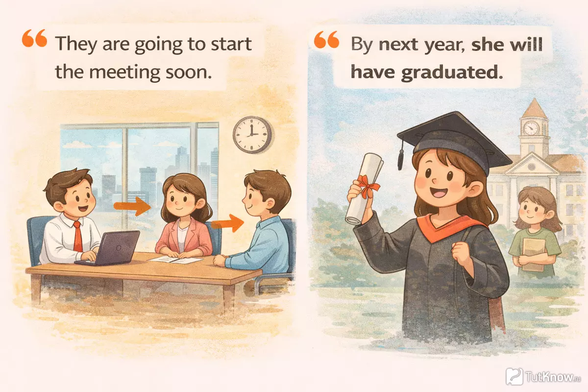 | Будущее время | tomorrow, next year, soon, in a minute — указывают на действия в будущем |