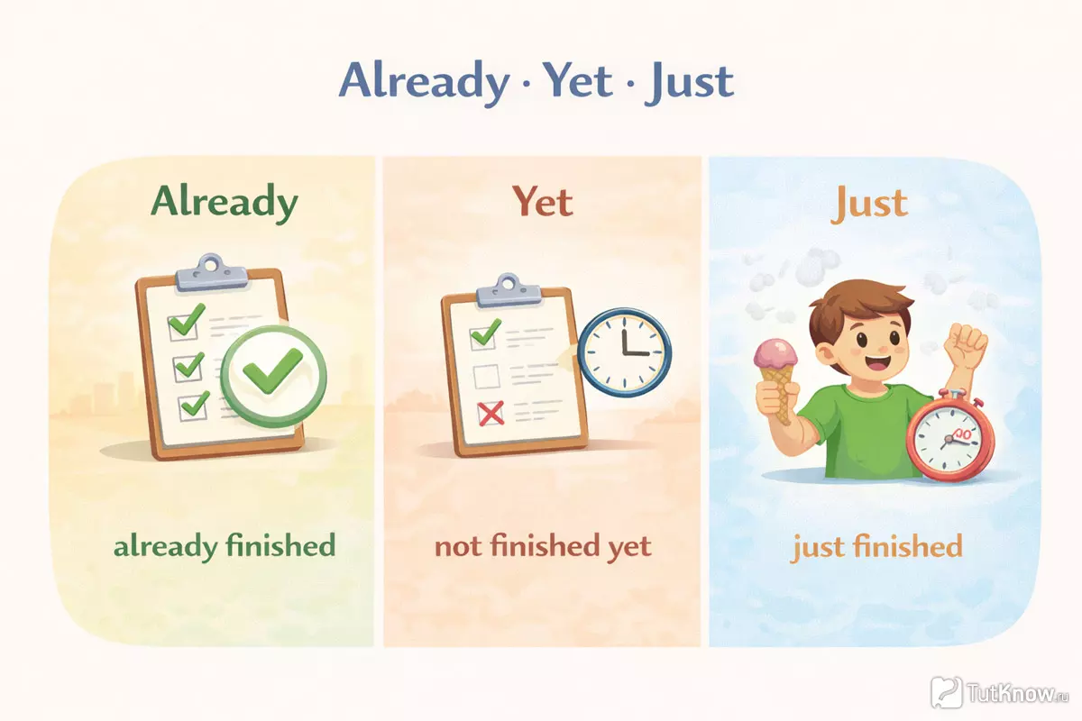 - Вспоминайте, что «already» подходит для завершённых действий, «yet» — для ожидаемых, а «just» — для только что случившихся.