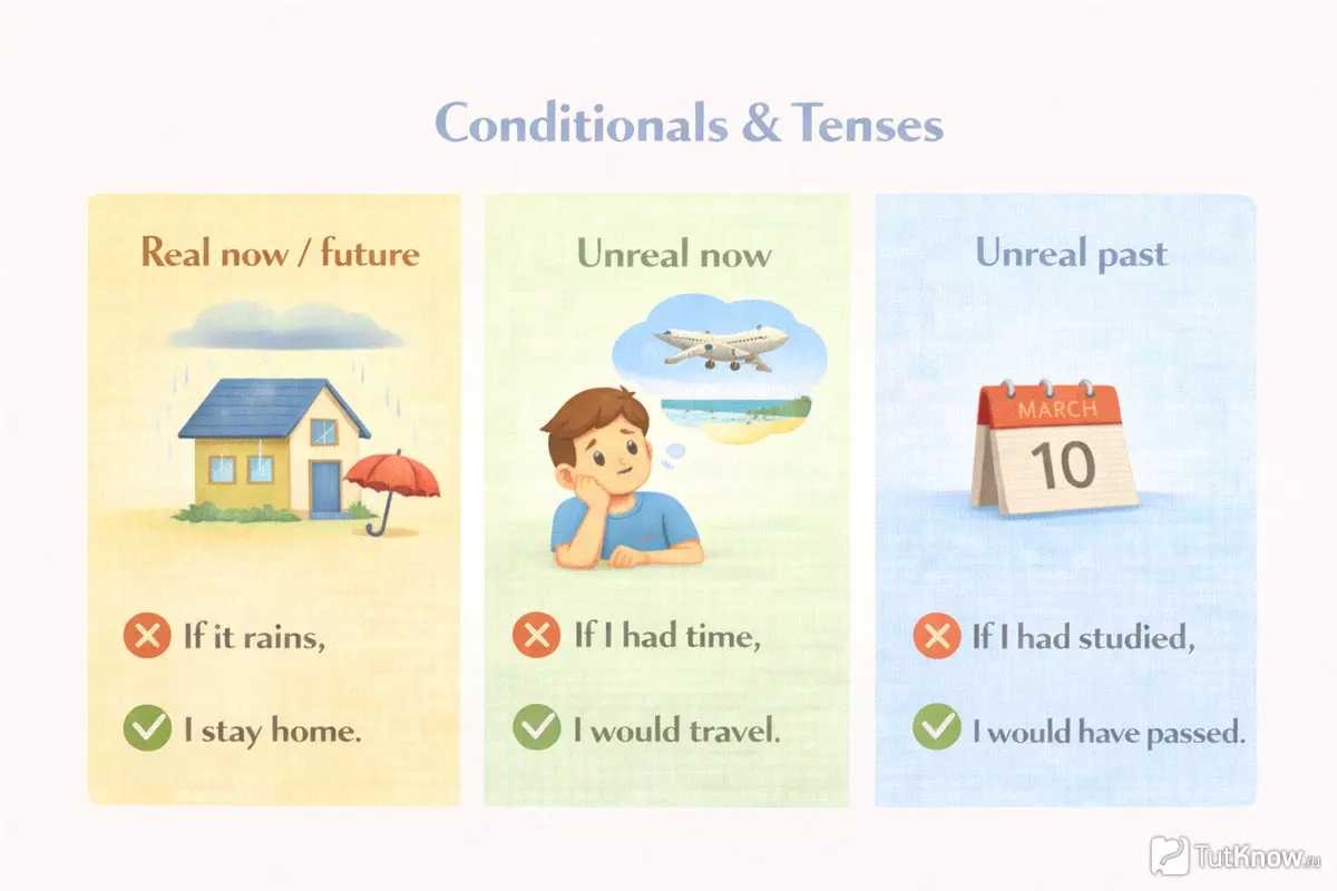 Часто путаница возникает из-за различий между русским и английским подходом к построению условных конструкций. Например, многие автоматически подставляют будущее время в обе части предложения, если речь идёт о событиях, которые могут произойти позже. В английском языке это считается ошибкой: будущее время в «if»-части не используется.