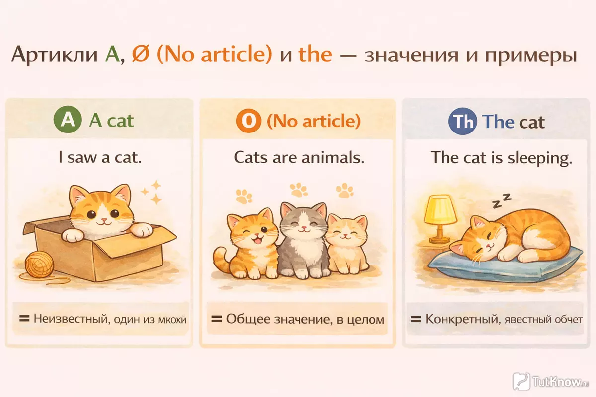 | Определённый (the) | Конкретный, уже известный или единственный предмет | the cat (та самая кошка), the sun (единственное солнце) |